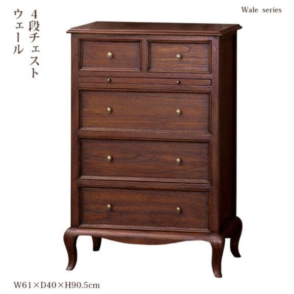 ウェール 4段チェスト -||- 幅広いお部屋に映えるシンプルで使いやすい4段チェスト。収納スペースが豊富で、お部屋の片隅を有効活用できます。木目調のナチュラルなデザインが、どんなインテリアにもマッチします。